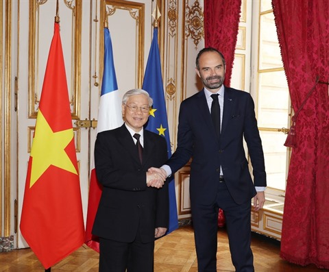 | Le le secrétaire général du PCV Nguyên Phu Trong (gauche) et le Premer ministre français Édouard Philippe, le 26 mars à Paris en France. |