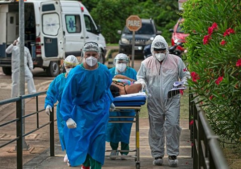 | Une malade du COVID-19 est transférée vers un hôpital à Santarem, au Brésil, le 7 février. |