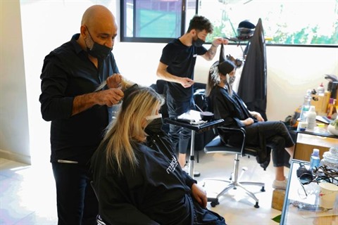 | Dans un salon de coiffure de Tel Aviv rouvert après l'assouplissement du confinement, le 7 février. |