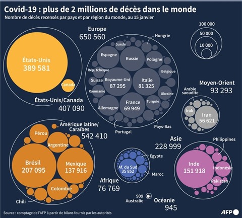 Au total, 2.000.066 décès ont été recensés, pour 93.321.070 cas déclarés, selon un comptage réalisé par l’AFP à partir de bilans officiels fournis par les autorités vendredi à 18h25 GMT.
