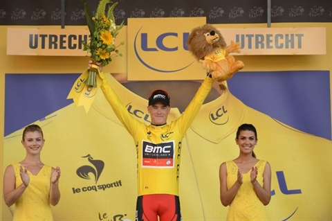 | Rohan Dennis endosse le premier maillot jaune de la 102e édition du Tour de France, le 4 juillet à Utrecht |