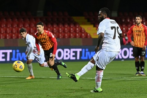 | Le milieu ivoirien de l'AC Milan, Franck Kessié, marque sur penalty lors du match de Serie A à Bénévent, le 3 janvier. |