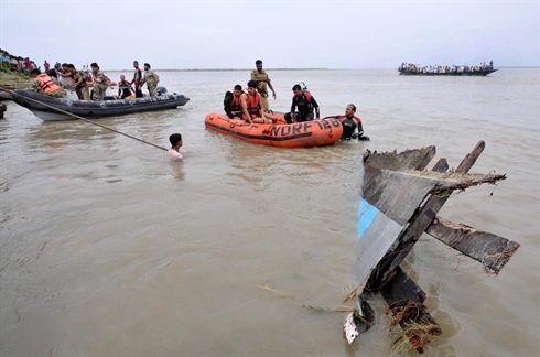| Les sauveteurs recherchent des victimes du naufrage du bateau sur le fleuve Brahmapoutre près de la ville de Dhubri, le 1er mai |
