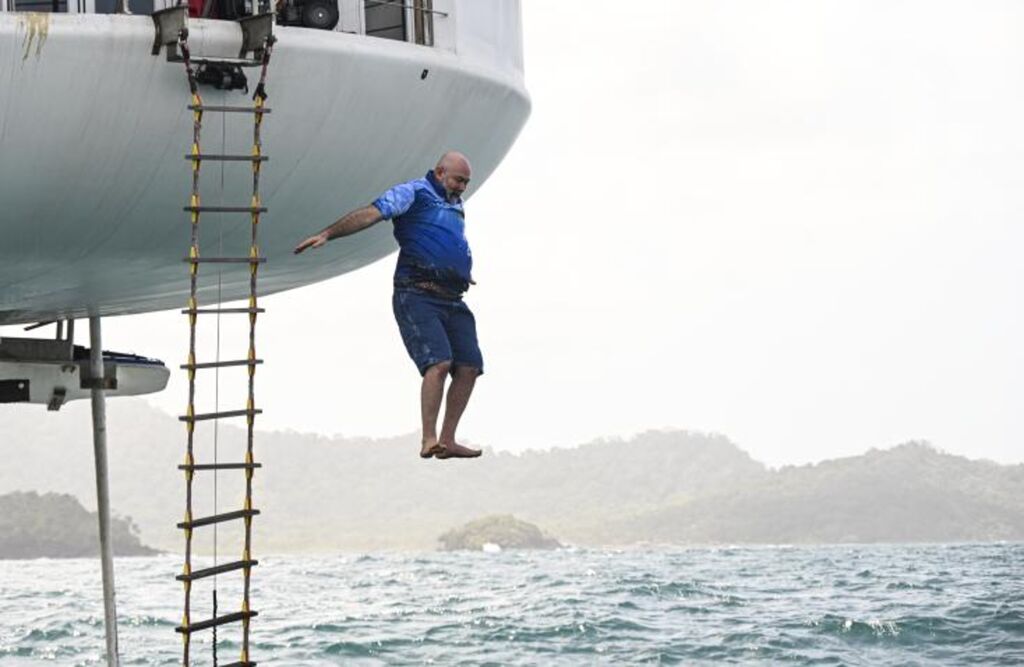 | L'ingénieur allemand Rüdiger Koch, 59 ans, se jette à l'eau après avoir battu le record du monde Guinness de 120 jours sous l'eau, à Puerto Lindo, Colón, au Panama, le 24 janvier 2025. |
