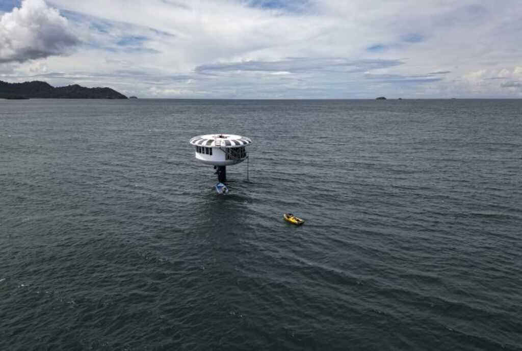 | Vue aérienne d'une maison perchée sur un cylindre métallique au-dessus des eaux, à laquelle est rattachée une capsule sous-marine au large de Puerto Lindo, au Panama, le 26 novembre 2024. |