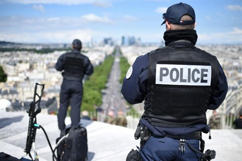 | Des policiers suveillent le défilé militaire depuis le sommet de l'Arc de Triomphe, le 14 juillet 2016 à Paris |