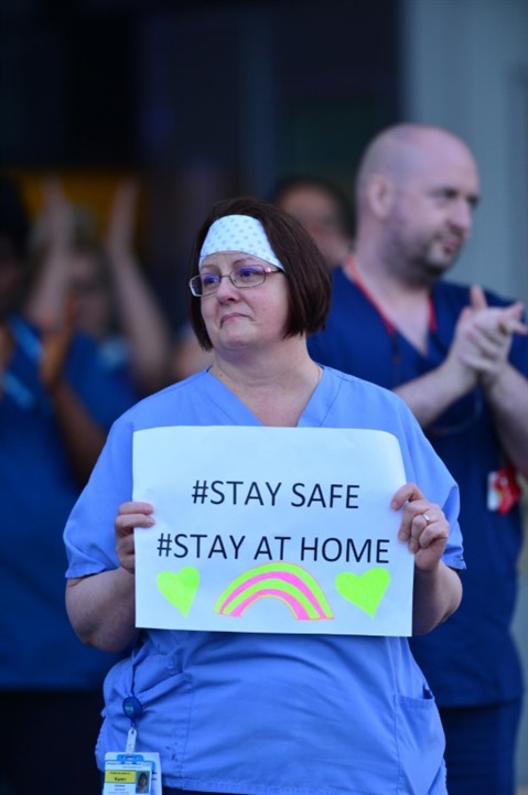 | Applaudissements dédiés au personnel médical en première ligne dans la lutte contre le nouveau coronavirus, devant un hôpital universitaire de Liverpool le 16 avril. |