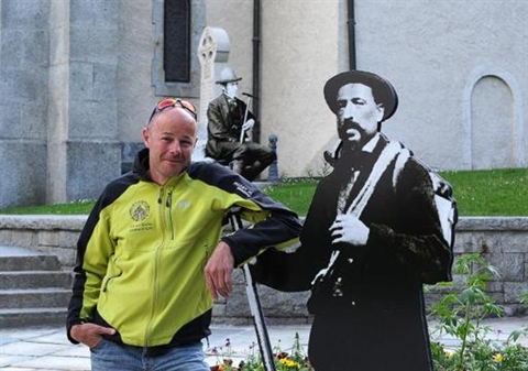 | David Ravanel, président de la compagnie des guides de Chamonix, pose près d'une affiche représentant le célèbre alpiniste Michel Croz, le 3 juin à Chamonix. |