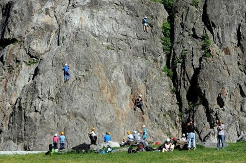 | Des personnes s'essaient à la pratique de l'escalade sur le "Rocher des Gaillands", le 3 juin à Chamonix, marquant le 150e anniversaire de la conquête de nombreux sommets des Alpes |