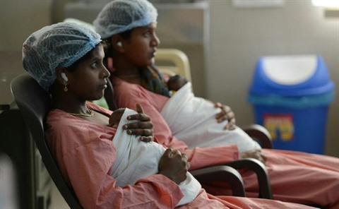 | Sur cette photo prise le 17 octobre 2017, deux mères s'occupent de leurs nouveau-nés dans une unité spécialisée à l'hôpital de Sangareddy dans l'Etat du Telangana en Inde. |