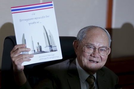 | Meechai Ruchupan, président du comité de rédaction du projet de Constitution, durant la présentation du document à la presse, le 29 mars à Bangkok. |