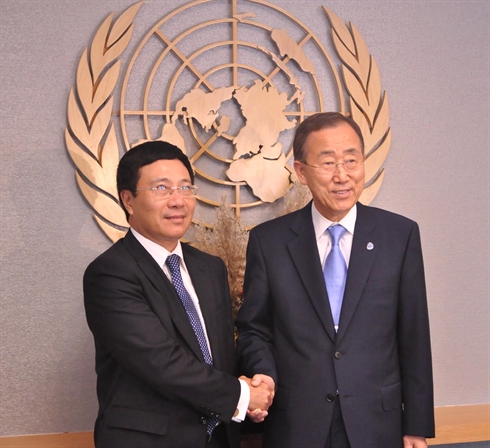 | Le ministre des Affaires étrangères Pham Binh Minh (gauche) rencontre le secrétaire général de l’ONU, Ban Ki-moon, en septembre 2011 à New York. |