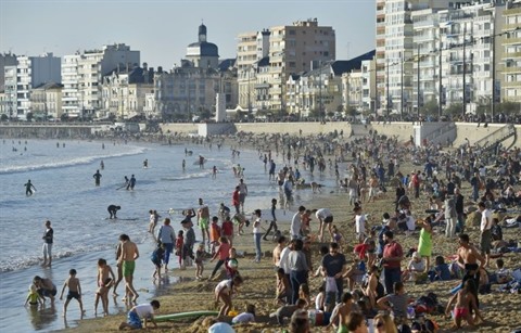 | Des personnes en nombre sur une plage des Sables-d'Olonne, le 31 octobre, en France. |