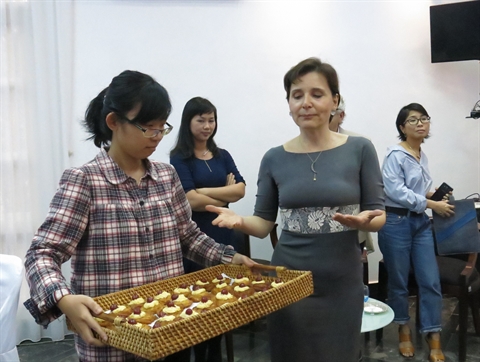 | L’ambassadrice italienne Cecilia Piccioni (1er plan, à droite) présente certains gâteaux traditionnels italiens de la fête pascale, le 16 mars à Hanoi. |