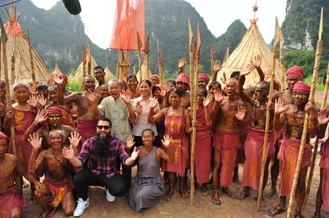 | Le réalisateur américain et l’ambassadeur du tourisme vietnamien, Jordan Vogt-Roberts pendant le tournage du film hollywoodien "Kong : Skull Island" à Tràng An, province de Ninh Binh (Nord). |