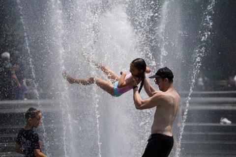 | Des personnes se rafraîchissent à New York le 19 juillet 2019 lors d'une vague de chaleur. |