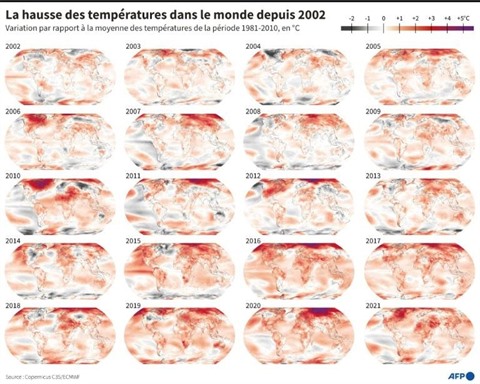Selon les différents services sur lesquels l'OMM base ses calculs 2021 est la cinquième année la plus chaude jamais enregistrée (Copernicus), tandis que la NOAA et Berkeley Earth, la mettent en sixième position et les services météorologiques japonais au septième rang.