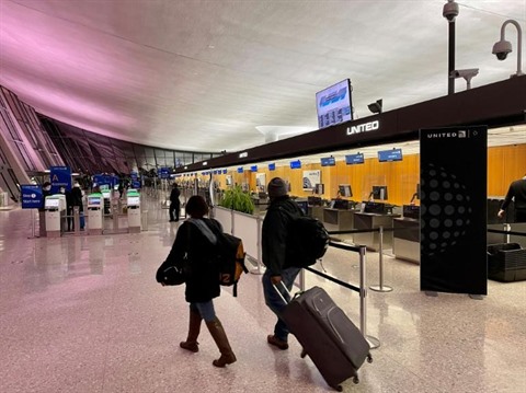 | Dans l'aéroport de Dulles, en Virginie, devant les comptoirs d'enregistrement de la compagnie United Airlines, le 2 mars. |