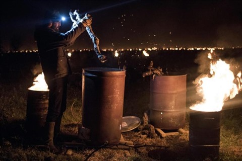 | Pierre-Marie Luneau entretient des braséros pour protéger ses vignes du domaine Luneau-Papin au Landreau, près de Nantes, le 12 avril. |