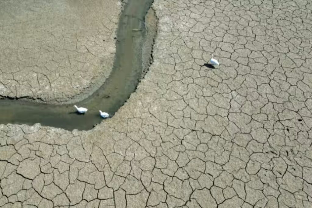 | Des oies se déplacent sur un étang presque asséché près d'Oud-Hervelee, en Belgique, le 14 mai. |