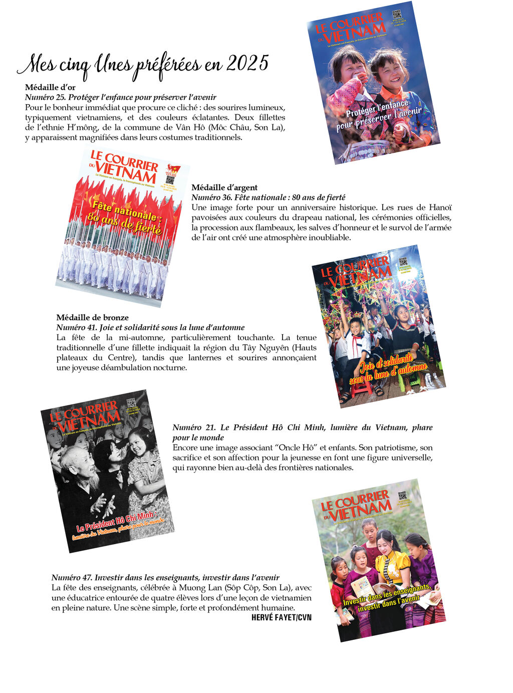 Dans le numéro 49, le regard se portait sur la province montagneuse de Lai Châu (Nord), où deux femmes issues d’une minorité ethnique avaient suivi une formation dispensée par un garde-frontière dans le cadre du programme d’“alphabétisation numérique”, préparant ainsi leur avenir. Celui-ci passera aussi par les énergies renouvelables : panneaux photovoltaïques et éoliennes figuraient en Une du numéro 32. Comme pour ce dernier, la Une du numéro 44 ne présentait ni personnages ni paysages, mais un logo : celui de la Convention de Hanoï sur la cybercriminalité, ouverte à la signature les 25 et 26 octobre 2025. Une première mondiale pour une ville vietnamienne, dans un domaine au cœur des enjeux internationaux.