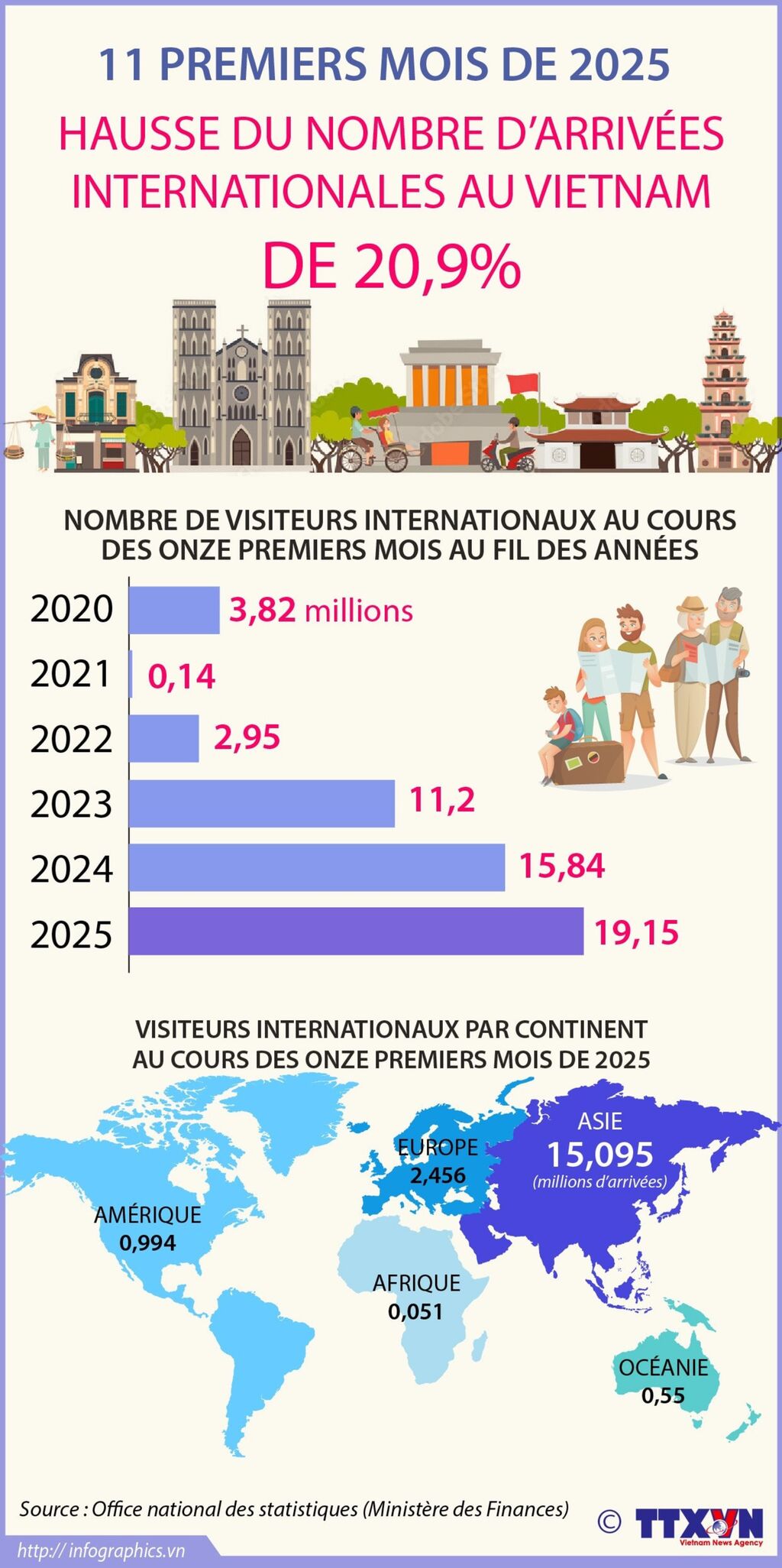 Selon les statistiques de l’Autorité nationale du tourisme du Vietnam, au cours des 11 premiers mois de 2025, le Vietnam a accueilli plus de 19,1 millions de visiteurs internationaux, soit une augmentation de 20,9 % par rapport à la même période en 2024, dépassant ainsi le record d'avant la pandémie de 2019.