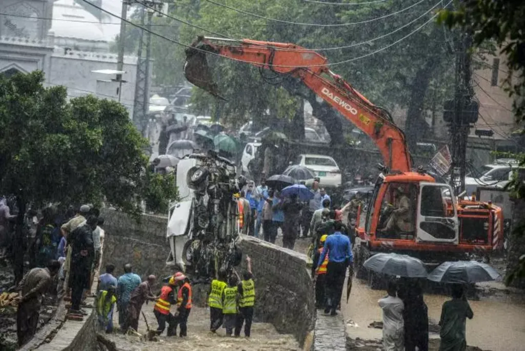 | Des sauveteurs et des habitants autour d'une grue retirant l'épave d'une camionnette après de fortes pluies de mousson à Islamabad, le 21 juillet au Pakistan. |