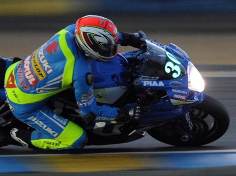 | Le Français Vincent Philippe sur sa Suzuki N.30, le 18 avril 2015, lors de la 38e édition des 24 Heures du Mans sur le circuit Bugatti. |