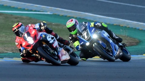 | La Yamaha No7 pilotée par l'Allemand Marvin Fritz chasse la Suzuki No1 du leader Gregg Black, aux 24 Heures du Mans, le 17 avril. |