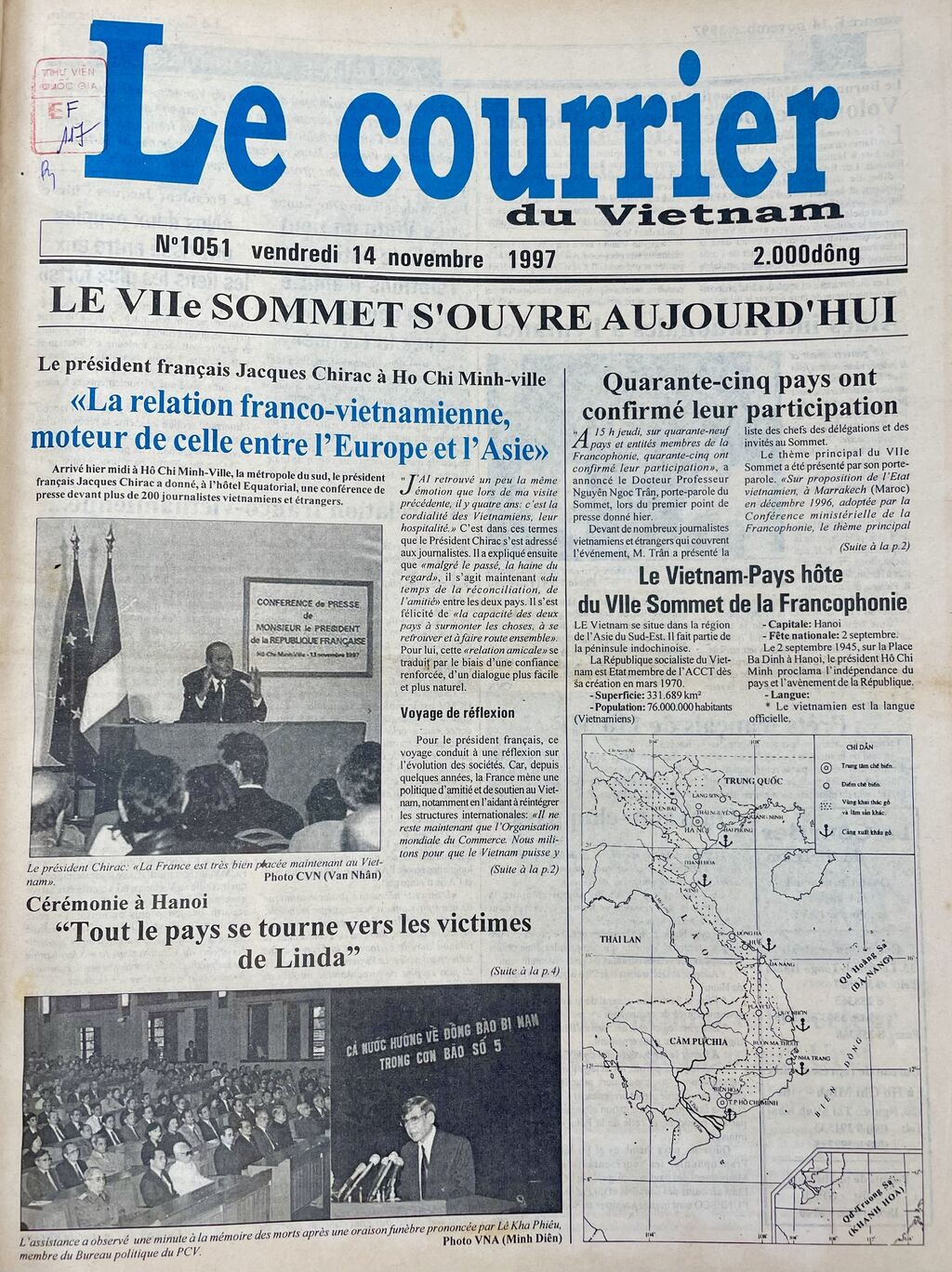 | La Une du quotidien du Courrier du Vietnam publié le 14 novembre 1997, la journée d'ouverture du VIIe Sommet de la Francophonie à Hanoï, au Vietnam. |