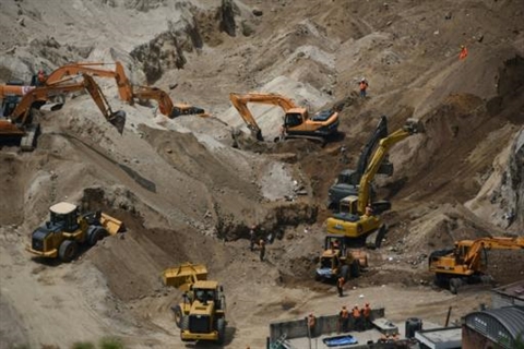 | Des pelleteuses et des équipes de secours à la recherche de victimes du glissement de terrain, le 9 octobre à Santa Catarina Pinula, au Guatemala. |