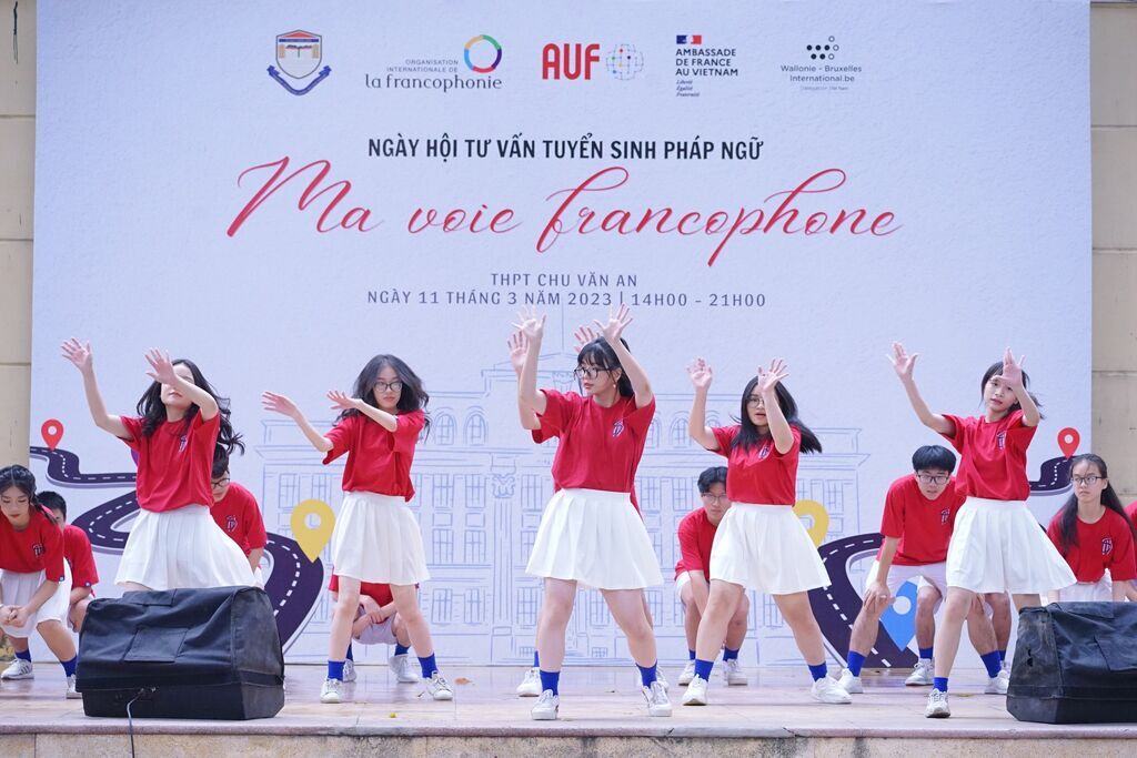 | Un numéro artistique lors du Forum des études supérieures “Ma voie francophone” consacré aux lycéens francophones des établissements scolaires du Nord du Vietnam, le 11 mars à Hanoï. |