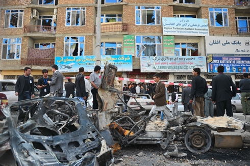 | Des agents de sécurité bouclent les épaves de voitures en face d'un bâtiment avec des fenêtres cassées à Kaboul, le 16 avril. |