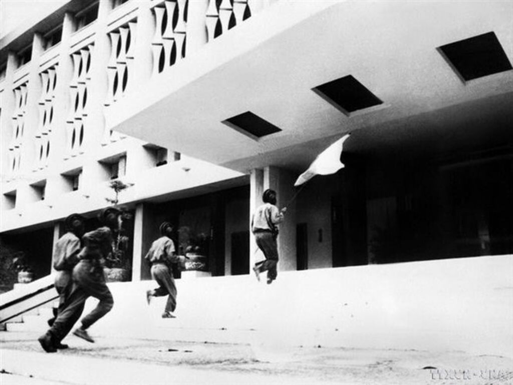 | Le soldat Bùi Quang Thân (portant le drapeau) et trois autres soldats s’avancent pour planter le drapeau de l’Armée de libération au sommet du Palais de l’Indépendance, le 30 avril 1975. |