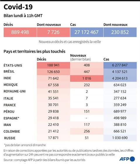 L'Inde de son côté est devenue lundi 7 septembre le deuxième pays du monde après les États-Unis recensant le plus grand nombre de cas de COVID-19 et dépasse le Brésil.