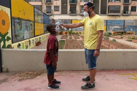 | Un enseignant vérifie la température d'un élève le jour de la rentrée des classes à Valence (Espagne) le 7 septembre. |