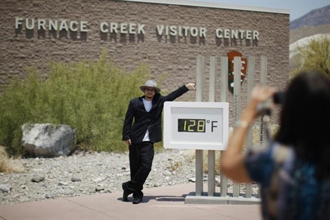 | Un touriste se fait prendre en photo à côté d'un thermomètre non officiel au centre des visiteurs de Furnace Creek, en Californie, le 30 juin 2013. |