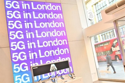 | Une boutique de télécoms à Londres, qui fait la promotion de la 5G, le 28 janvier. |