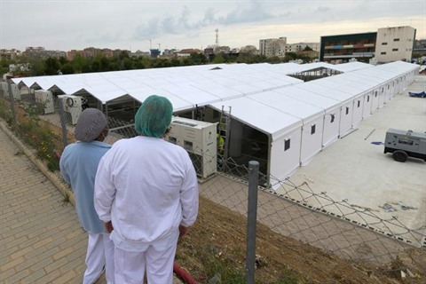 | Des soignants regardent la construction d'un hôpital de campagne pour accueillir des patients atteints du COVID-19, le 5 avril à Valence. |