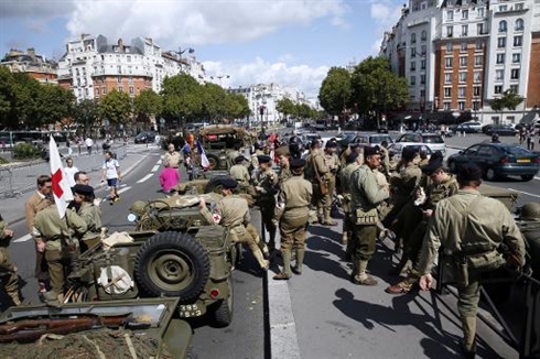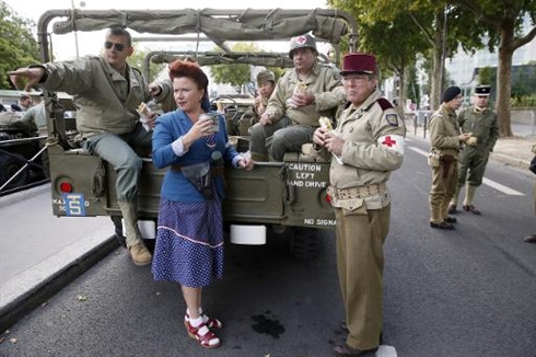 | Des Parisiens portent les vêtements des soldats de la deuxième guerre mondiale, le 23 août à Paris à l'occasion du 70e anniversaire de la Libération de Paris |