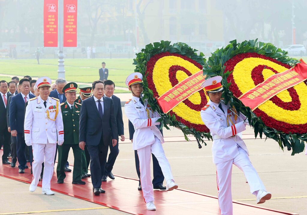 Les dirigeants ont déposé une gerbe de fleurs portant l’inscription : "Se souvenir à jamais du grand Président Hô Chi Minh".
