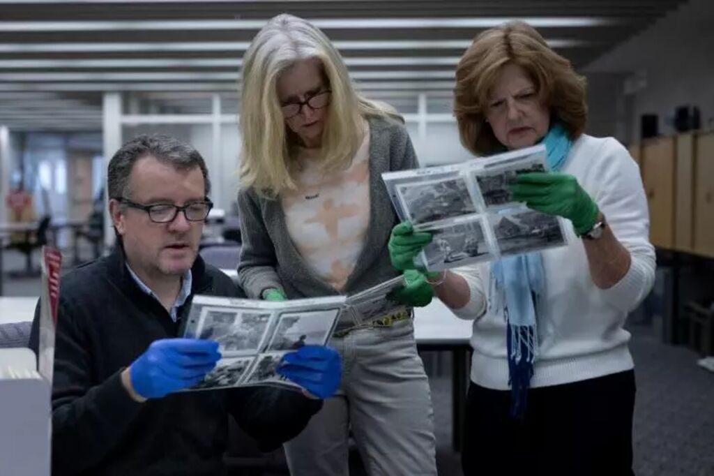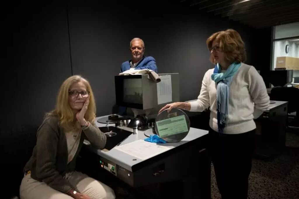 | Jennifer Taylor-Rossel, Robert Neal Marshall et Patricia Spae dans la salle de visionnage des bobines des archives nationales américaines près de Washington, le 10 mai. |