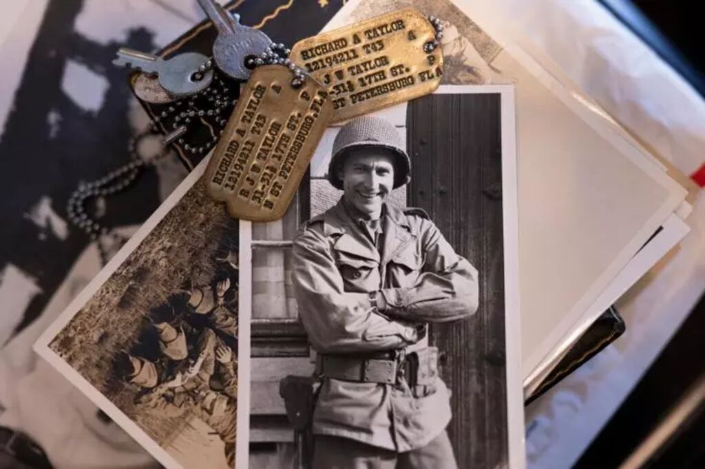 | La plaque d'identité militaire et des photos du caméraman militaire américain Richard Taylor, montrés par ses deux filles, le 10 mai près de Washington. |