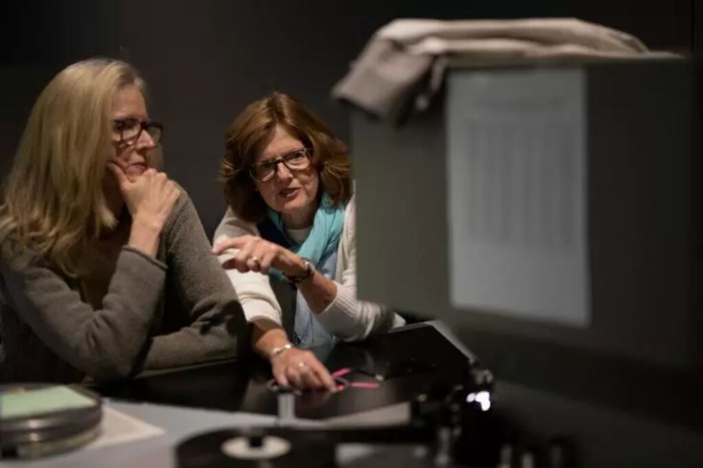 | Jennifer Taylor-Rossel et Patricia Spae, filles du sergent Richard Taylor, en train de regarder ses bobines aux archives nationales américaines près de Washington, le 10 mai. |