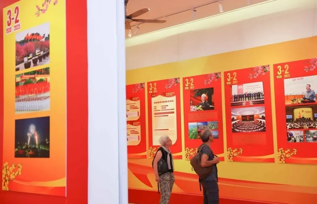 | Des visiteurs internationaux visitent une exposition sur le Parti à Hanoï à l'occasion du 95e anniversaire de la fondation du Parti communiste du Vietnam. |