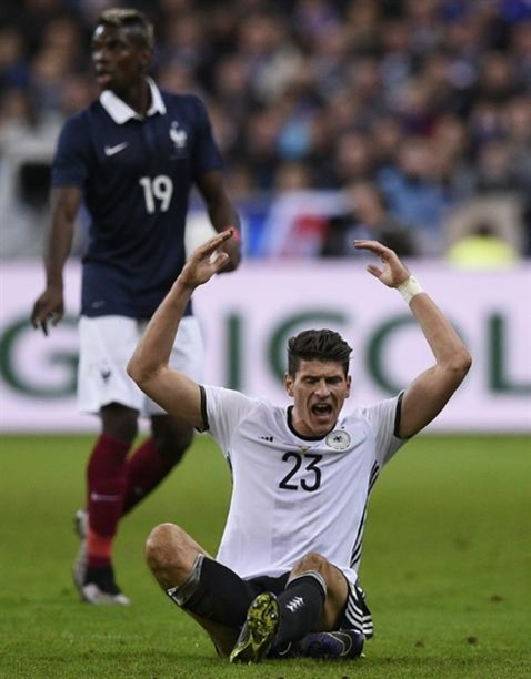 | Mario Gomez (à terre), en match amical face à la France, le 13 novembre 2015 au Stade de France. |