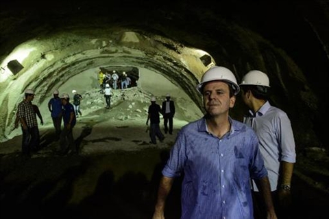 | Le maire de Rio de Janeiro, Eduardo Paes, visite un tunnel urbain en creusement dans la zone portuaire de la ville, le 24 mars. |