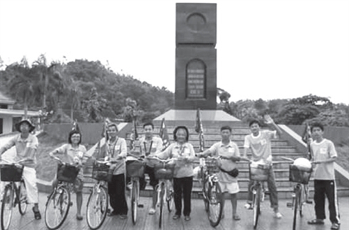| Mme Tuy (centre) lors de son voyage à vélo transnational en 2008, devant la borne matérialisant le début de la piste Hô Chi Minh (Tân Ky, province de Nghê An). |