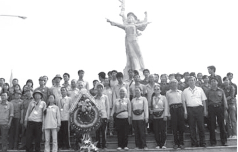 | Mme Tuy (6e, droite, premier rang) lors de son périple transnational en 2008, devant la statue de la victoire à Long Khanh (province de Dông Nai). |