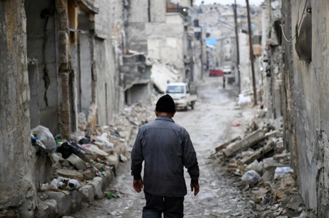 Un homme marche dans les rues encore dévastées par les combats du quartier Kalasse d'Alep le 16 décembre, près d'une an après la victoire de Damas sur les opposants. Photo : AFP/VNA/CVN |